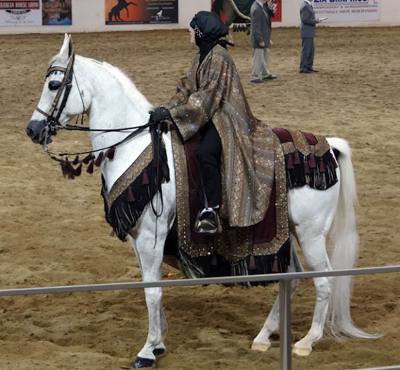 You can see these are magnificent animals. After the 13 and under group there was a short break. Next up was the Half-Arabian/Anglo-Arabian Mounted Native Costume class. Well, I had no idea what that was, but, I knew that native costume stuff sounded very special! And, indeed, special it was! The native costume class celebrates the deep relationship of the Arabian horse and the Bedouins of Africa.