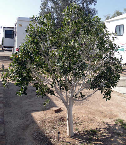 I wanted a photo of this tree so I could attempt to identify it, it was a nice size, small, compact. Is it a lemon or other citrus tree?? Bark is very white. (By the way, we are looking only at the green foliage, did not realize I had that other tree in the back ground. SIGH)